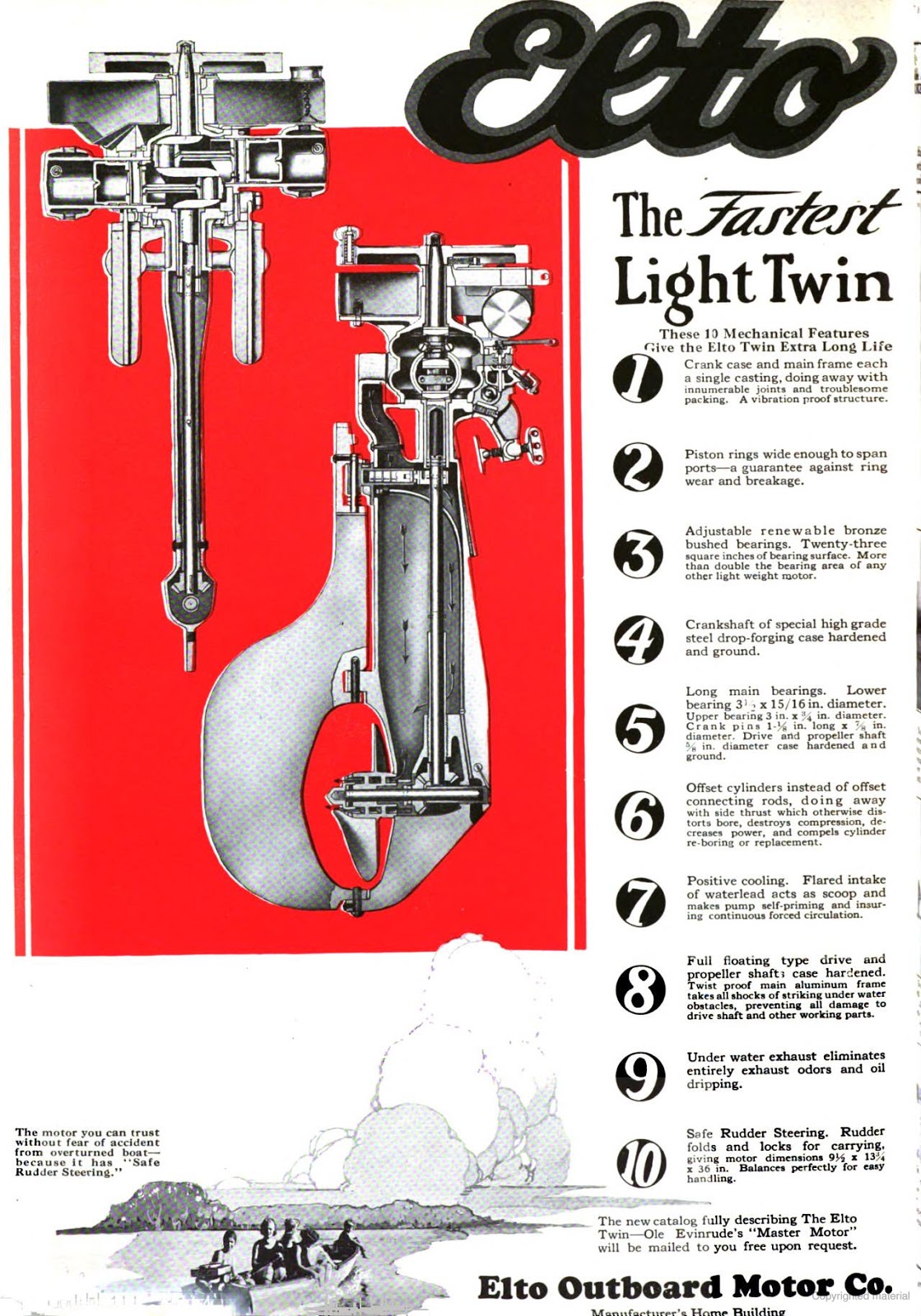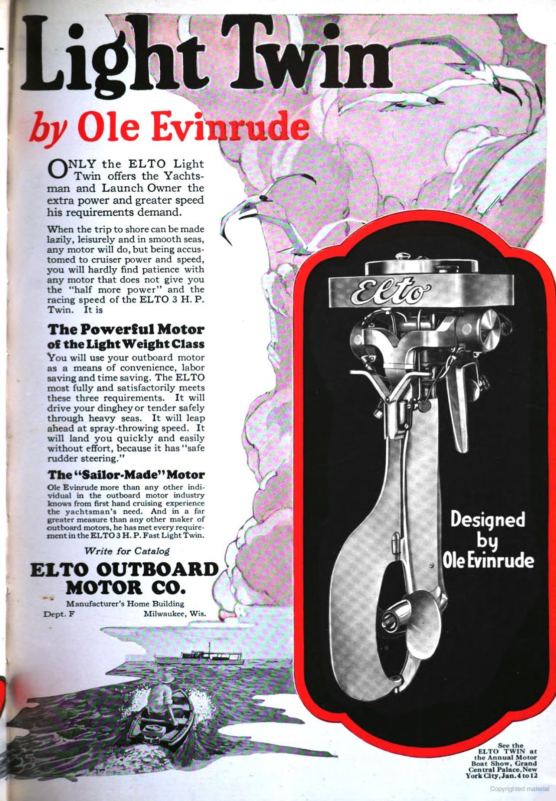 Elto Outboard Motor Company ⇒ merged into OMC in 1929. Elto production ceased in 1941.